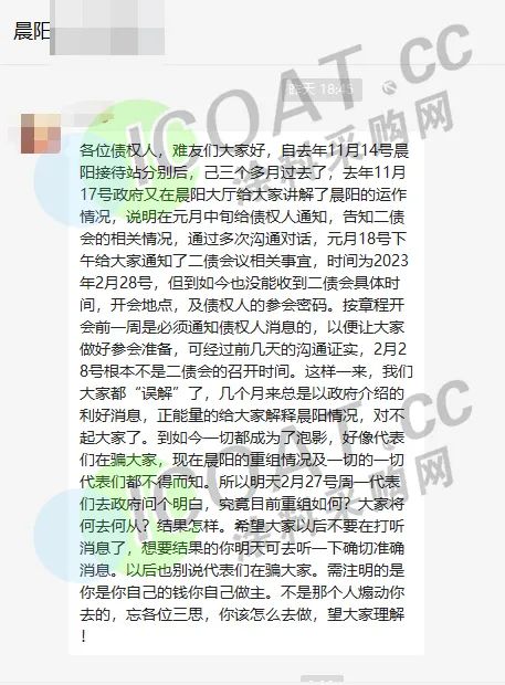 继去年11月中旬晨阳领导小组办公室发布了《关于晨阳问题的有关答复》(点击查看详情),并公布“初定1月中旬正式向债权人发送债权人会议相关通知”的消息后,数千债权人一直在关注相关信息。有不少人质疑,1月中旬正值小年前后,大家忙着张罗过年的事情,是不是会把这件事情延期。