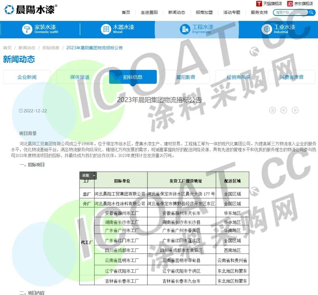 涂料采购网注意到,晨阳水漆官网上近期发布了2023年晨阳集团物流招标公告,诚邀掌握良好的配送网络资源、具有先进的管理水平和优质的服务理念的物流公司参与2023年度物流项目的招标,并最终成为合作伙伴,2023年度预计总发货量20万吨。