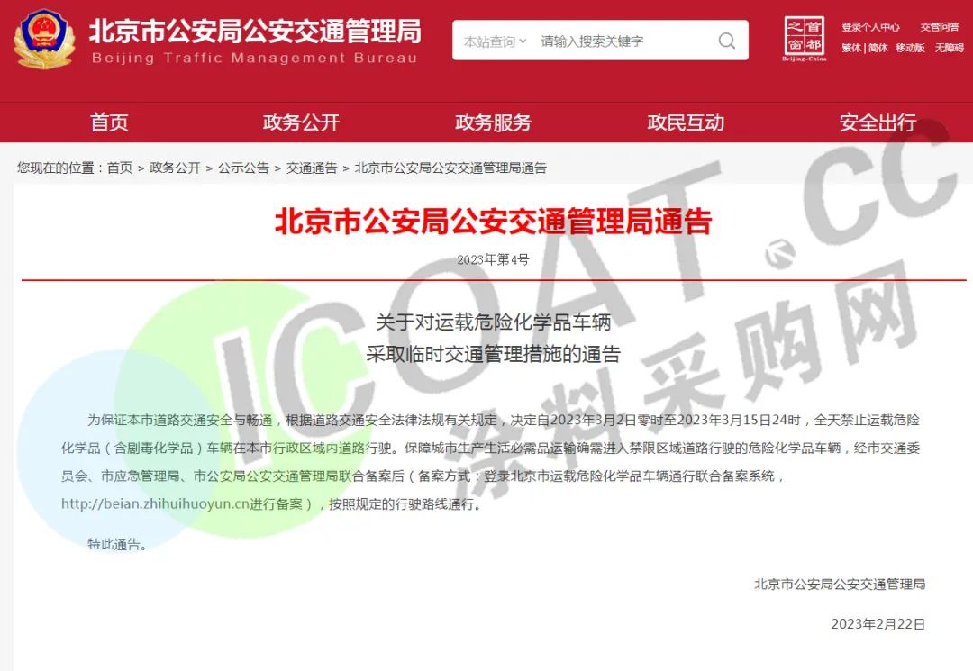 北京市公安局公安交通管理局发布通告,为保证本市道路交通安全与畅通,根据道路交通安全法律法规有关规定,决定自2023年3月2日零时至2023年3月15日24时,全天禁止运载危险化学品(含剧毒化学品)车辆在本市行政区域内道路行驶。