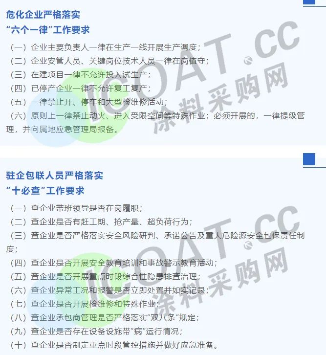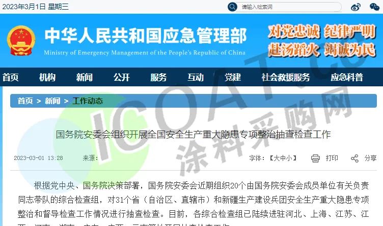 为切实做好全国“两会”期间危险化学品安全生产工作,坚决防范各类生产安全事故发生,涂料采购网提醒各位涂料、化工老友,做好强化隐患排查治理、严格特殊作业管控,强化危化品运输管理和使用安全。无论是一线员工还是领导带班,都要加强应急值班值守,一旦发生生产安全事故和突发事件要及时处置,并第一时间报告有关部门。