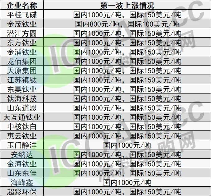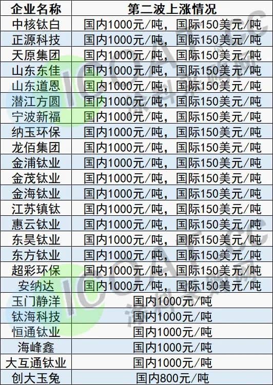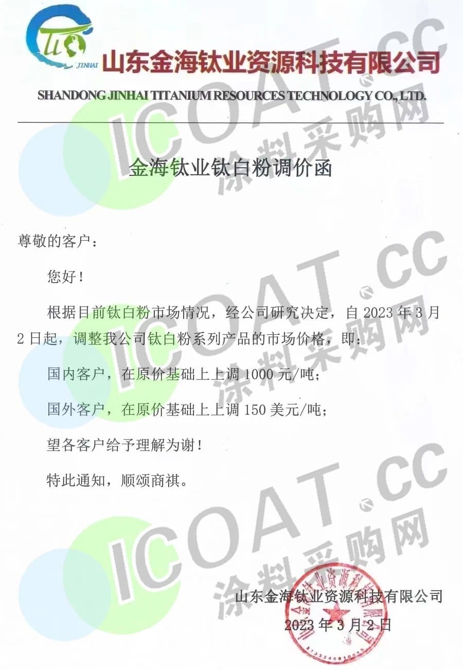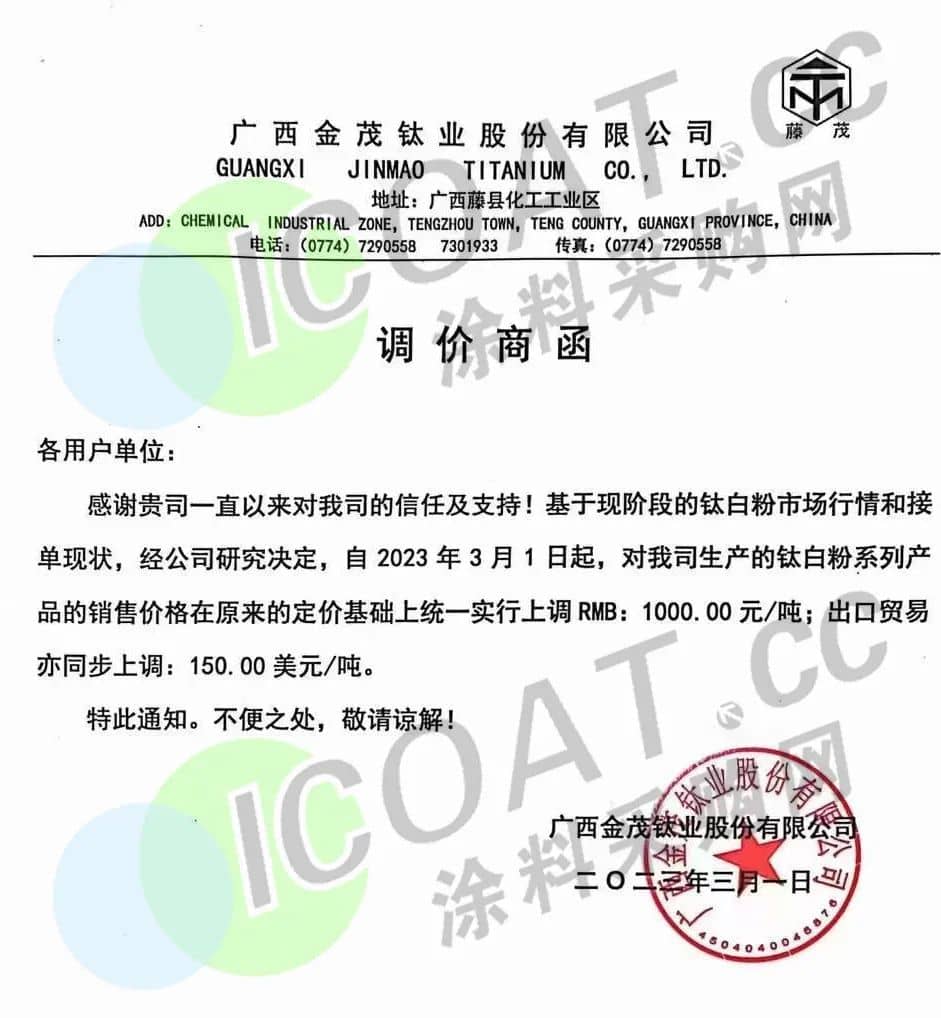 广西金茂钛业表示,自3月1日起,钛白粉系列产品的销售价格在原来的定价基础上统一实行上调1000元/吨,出口贸易亦同步上调150美元/吨。