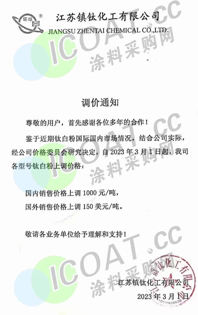 事实上,这已经是2023年春节后第二波钛白粉企业发函宣涨,2月底3月初已有十几家钛白粉企业集体行动,国内普涨1000元/吨,国际上涨150美元/吨左右。