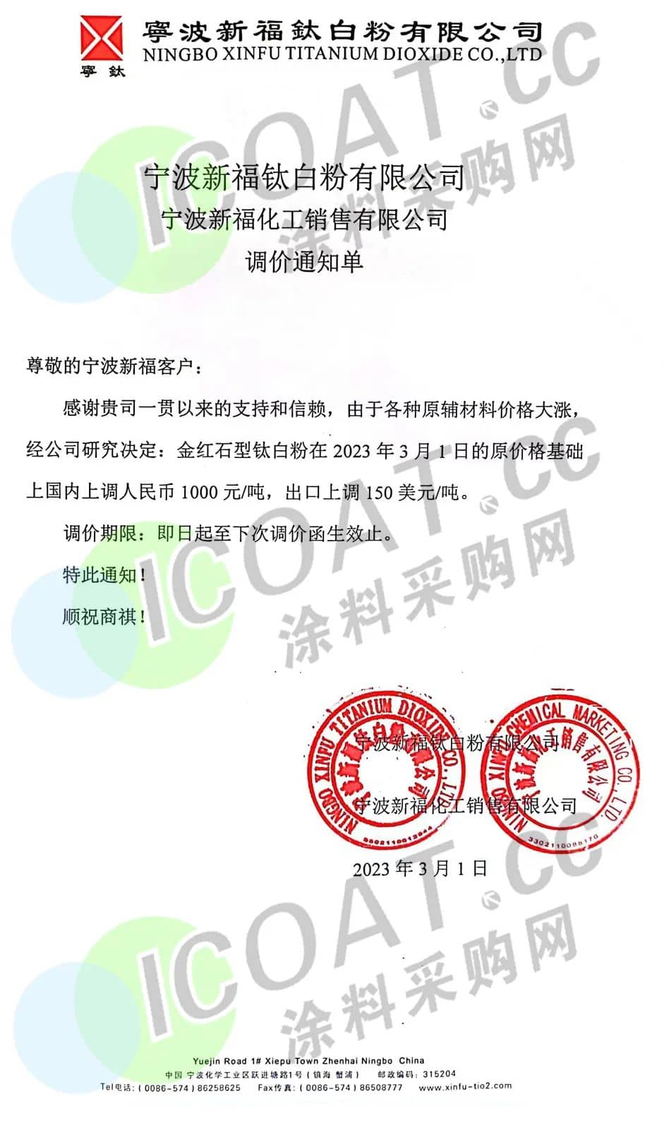 宁波新福钛白粉表示,金红石型钛白粉在3月1日的原价格基础上国内上调1000元/吨,出口上调150美元/吨。