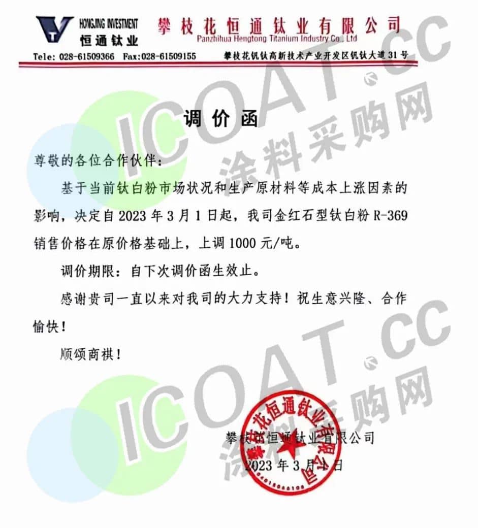 攀枝花恒通钛业表示,自3月1日起,金红石型钛白粉R-369销售价格在原价格基础上,上调 1000元/吨。