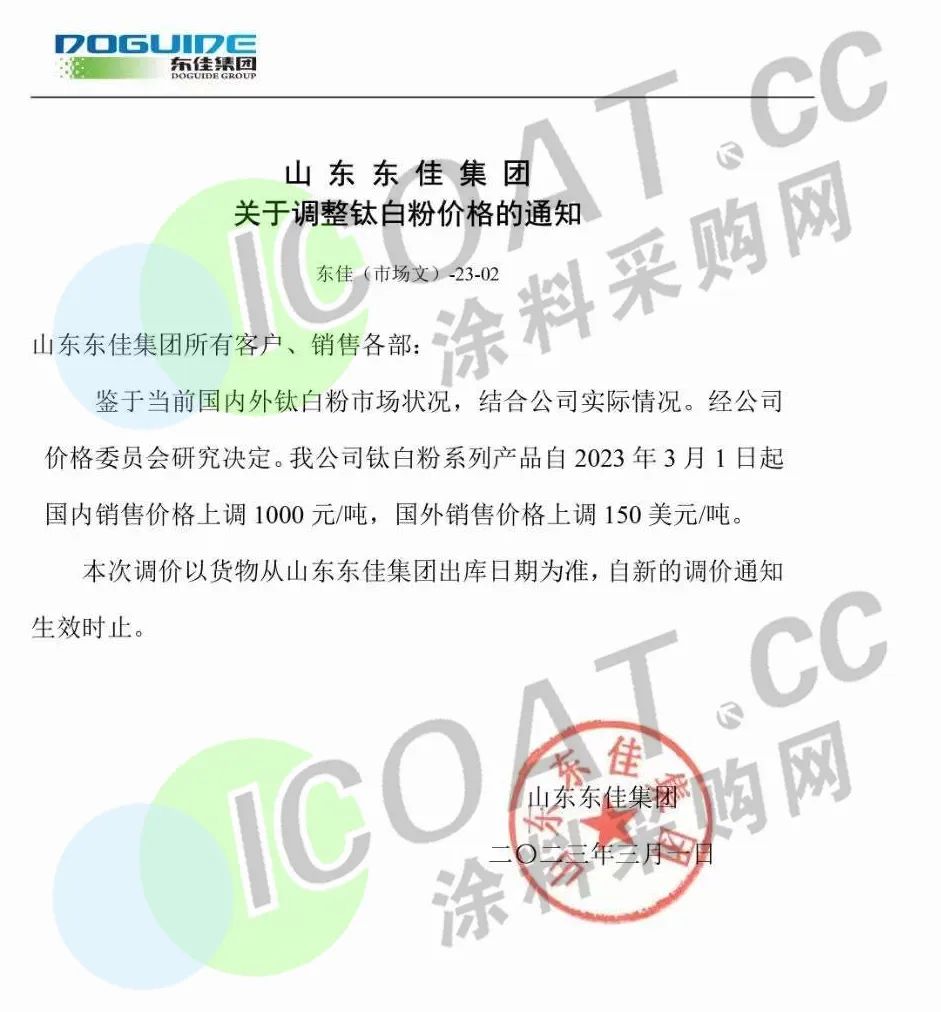 山东东佳集团表示,自3月1日起,钛白粉产品国内销售价格上调1000元/吨,国外销售价格上调150美元/吨。