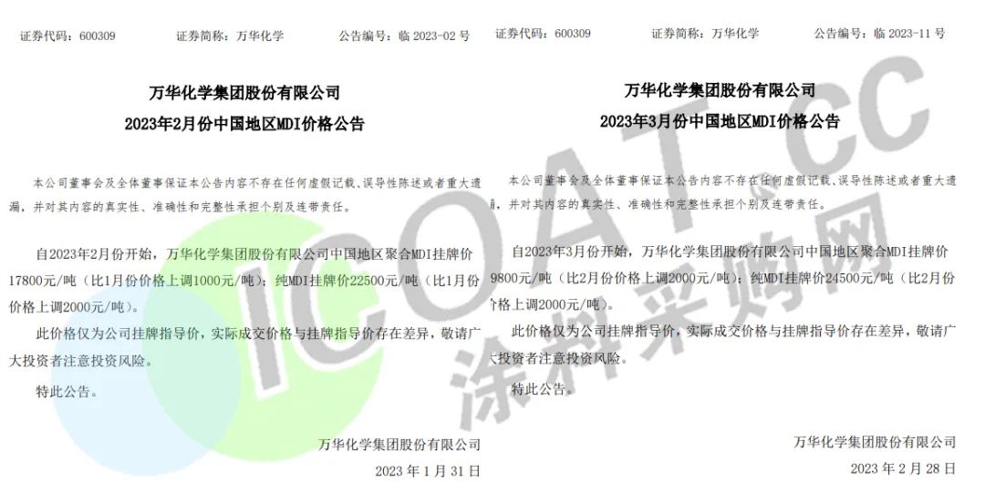 MDI行业,万华化学在春节后发布的两次国内MDI价格公告都提及了涨价事宜,国内聚合MDI挂牌价累计上调3000元/吨,纯MDI挂牌价累计上调4000元/吨。