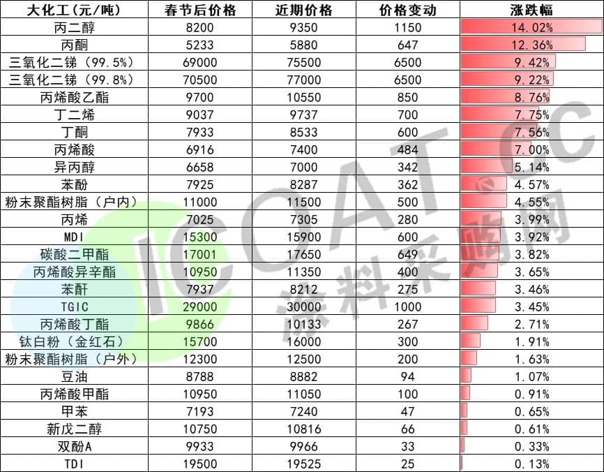 丙烯酸目前报价7400元/吨,较春节开工后报价上涨484元/吨,涨幅7.00%;异丙醇目前报价7000元/吨,较春节开工后报价上涨342元/吨,涨幅5.14%;