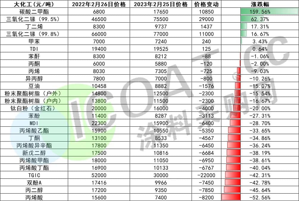 可以看出,2023是涂料化工企业准备大干一场的一年,相对于充满信心这个名词,更多的化工企业青睐于“谨慎乐观”的观点。看似涨价迅猛,但据涂料采购网了解,这些化工品的价格较2022年的同期价格仍有很大的差距。
