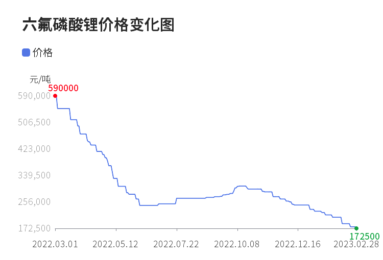 六氟磷酸锂日跌7000元/吨,目前已跌至172500元/吨,2月下跌超4万元/吨,跌幅19.77%。从2020年的不到7万元/吨,到2022年3月的高点60万/吨,六氟磷酸锂涨幅已超700%,但目前六氟磷酸锂的价格一路下行,较去年的高点下跌71%。