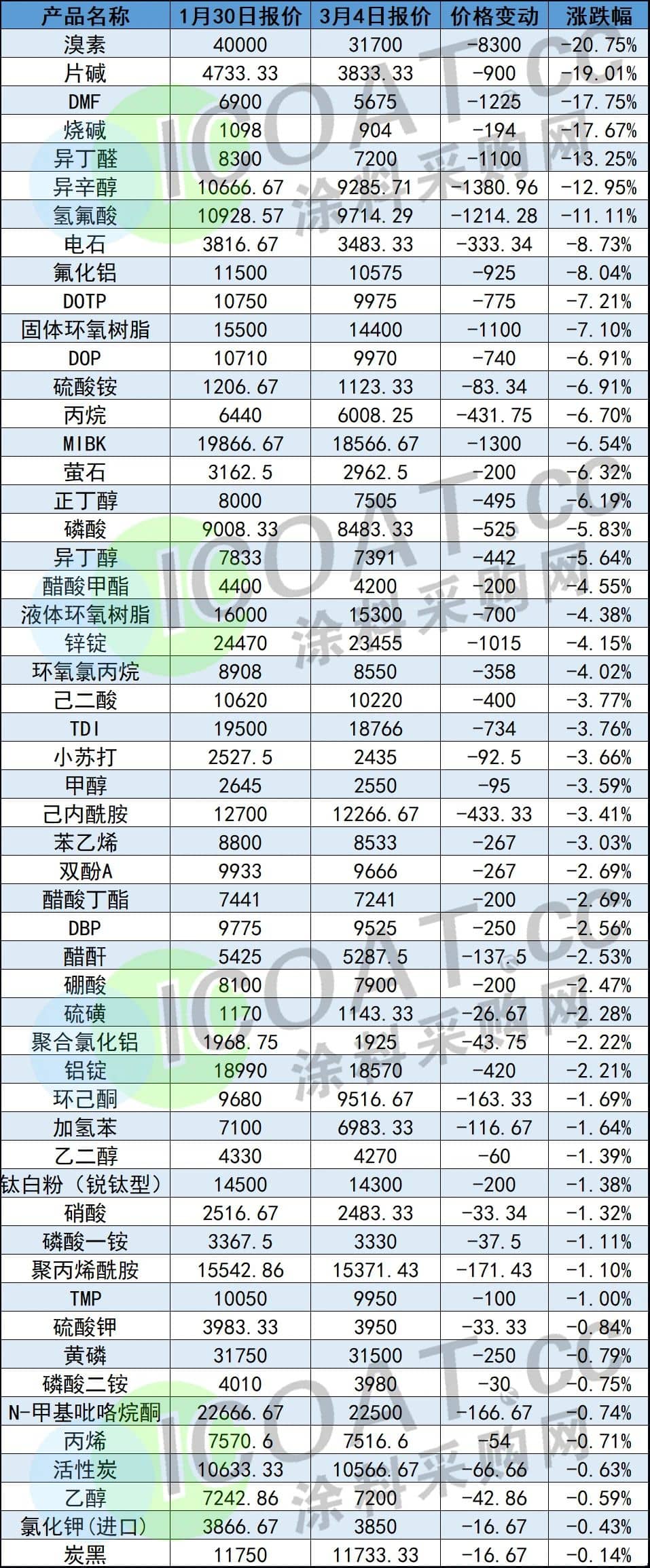 溴素价格下跌8300元/吨,至31700元/吨,跌幅20.75%;