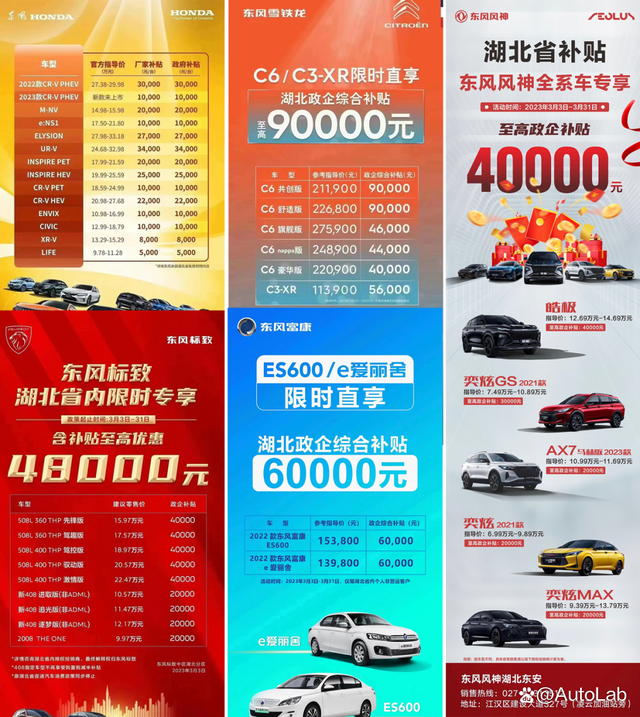 3月以来,湖北省联合多家车企推出政企购车补贴,其中涉及的“东风系”品牌降幅最大、范围最广,涵盖东风风神、东风雪铁龙、东风标致、东风本田、东风日产、东风富康和岚图7个品牌、56款车型,补贴力度从5000元至9万元不等,原价11.39万元的C3-XR致尚版优惠下来只要5.79万元。