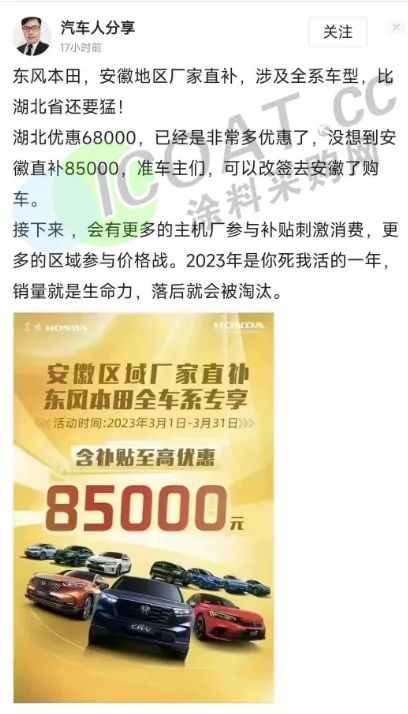 除湖北地区外,在贵州、云南及安徽等地的东风本田也开启了“全系车型限时直补”,贵州、云南区域的厂家双补最高至6万元,而安徽区域最高达8.5万元。