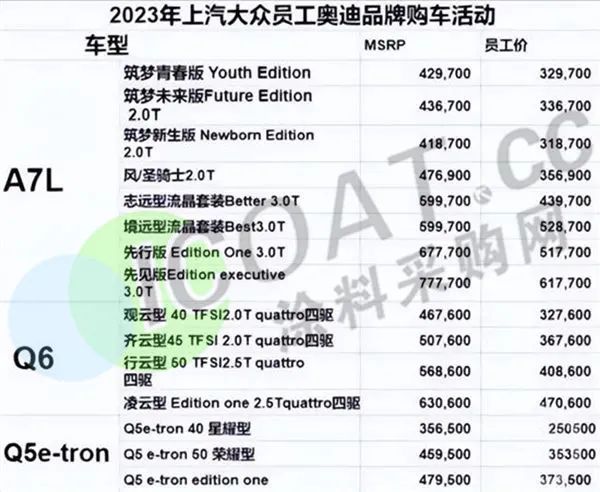 上汽大众流传于网络上的《2023年上汽大众员工奥迪品牌购车活动》的图片,奥迪旗下在售的三款产品(A7L、Q6L、Q5 e-tron)给出了员工购车价,优惠区间在7万-16万元,这也就意味着不到33万购买一台奥迪A7L。