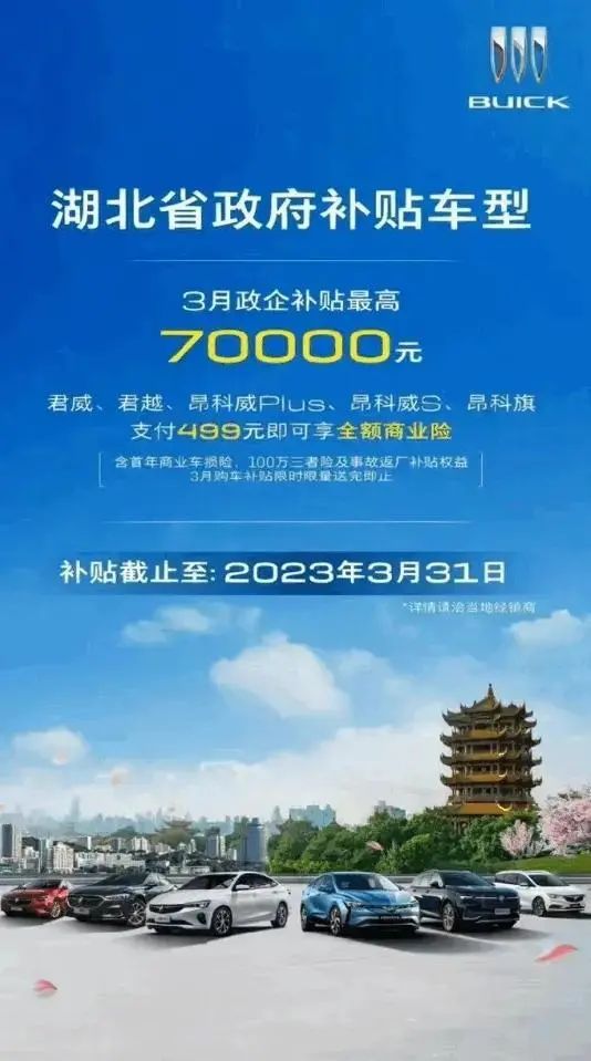 上汽通用旗下别克也宣布加入了湖北地区“补贴降价”大军,截止至3月31日,政企补贴最高7万元,君威、君越、昂科威Plus、昂科威S、昂科旗等车型,均享有补贴资格。购车者只需要支付499元,即可享受全额商业险,包括首年商业车损险,100万三者险及返厂补贴权益,送完即止。