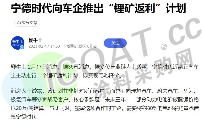 公开消息表示,这个合作将在今年三季度开始执行,面对的是理想、蔚来、赛力斯、极氪等跟宁德时代深度合作、采购量大的战略客户。目前2023年一季度尚未结束,碳酸锂的价格已经由去年11月的60万元/吨跌至37.6万元/吨,几近腰斩,但是距离宁德时代“大计划”中的20万元/吨将有近一半的降价空间,让业内人士不禁咋舌。