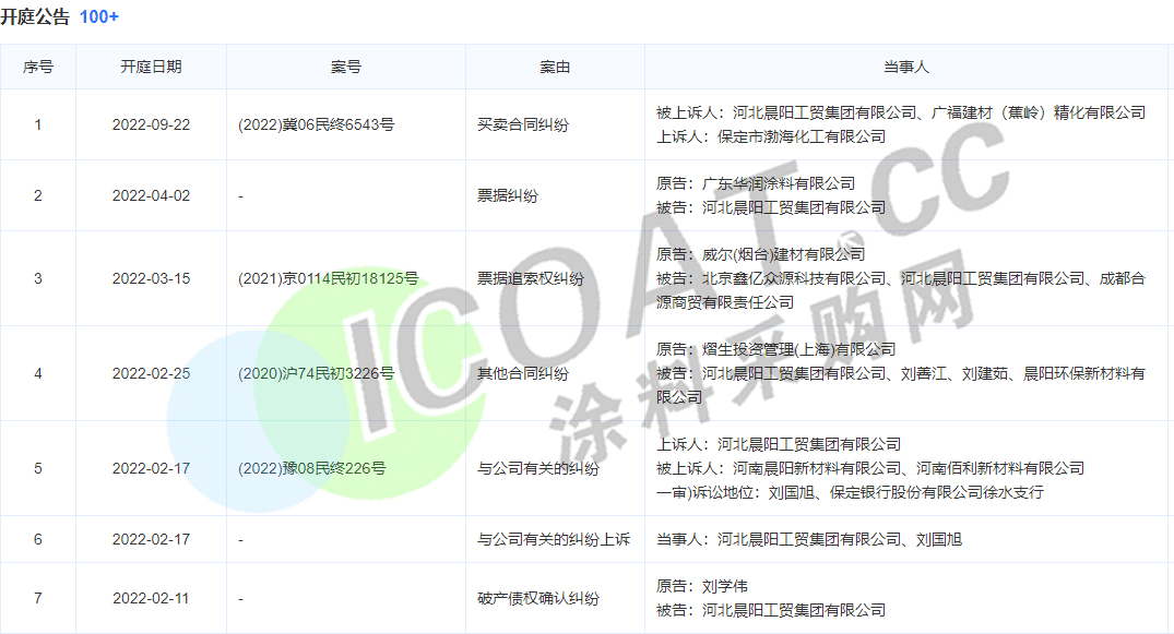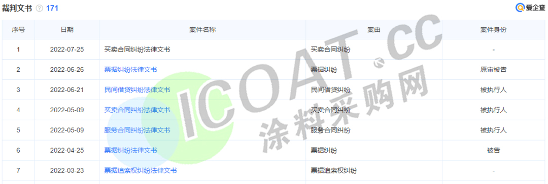 网络部平台显示,晨阳水漆裁判文书涉及171项,仅2022年内就有7项,其中包括买卖合同纠纷、票据纠纷、民间借贷纠纷、服务合同纠纷、票据追索权纠纷、财产保险合同纠纷等。