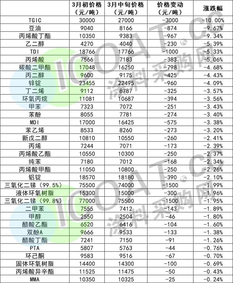 TGIC3月中旬报价27000元/吨,较3月初价格下跌3000元/吨,跌幅10.00%;