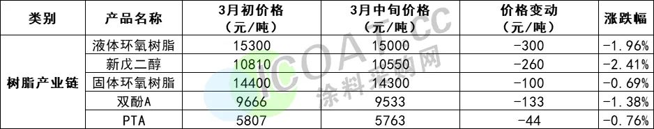 涂料采购网注意到,3月以来跌价的部分化工原材料同时也是涂料产业链重要组成之一,例如树脂产业链,液体、固体环氧树脂价格分别下跌300元/吨、100元/吨,跌幅在1%左右,新戊二醇价格下跌260元/吨,PTA价格下跌44元/吨。