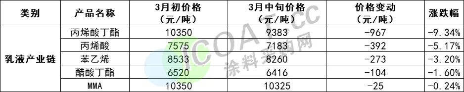 丙烯酸丁酯3月中旬9383元/吨,较3月初价格下跌967元/吨,跌幅9.34%;