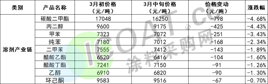 溶剂产业链方面,碳酸二甲酯价格下跌798元/吨,丙二醇价格下跌425元/吨,跌幅均在4%左右,甲苯、纯苯、二甲苯、醋酸乙酯等原材料的价格也出现了不同程度的下跌。