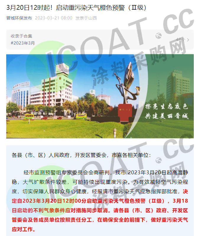 山西省晋城环保发布微信公众号消息,为有效减轻空气污染程度,切实保障人民群众身心健康,经报请市重污染天气应急指挥部批准,决定自2023年3月20日12时00分启动重污染天气橙色预警(Ⅱ级)。同时,一系列强制性污染减排措施也随之公布。