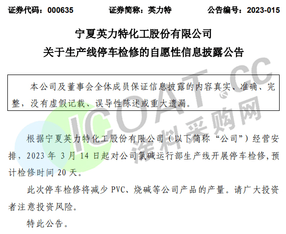 宁夏英力特化工公告,3月14日起对公司氯碱运行部生产线开展停车检修,预计检修时间20天。此次停车检修将减少PVC、烧碱等公司产品的产量;