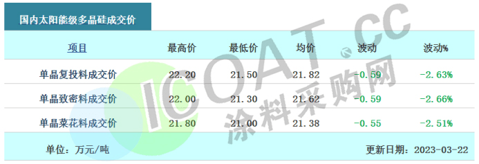 单晶复投料成交价21.50-22.20万元/吨,平均为21.82万元/吨,均价下降2.63%。
