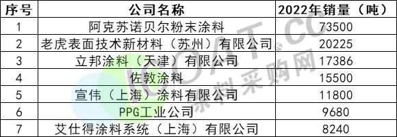 与此同时,榜单中有7家外资企业,销量共计156331吨,占粉末百强企业的14.42%,前三名分别为阿克苏诺贝尔伟德客户端官网、老虎表面技术新材料(苏州)有限公司、立邦涂料(天津)有限公司。荷兰粉末涂料企业阿克苏诺贝尔毫无疑义的登上了2022年伟德客户端官网百强榜首的宝座,且已经蝉联七年,如今在中国已建立几十个基地,还建有技术中心和遍布全国的销售办事处。