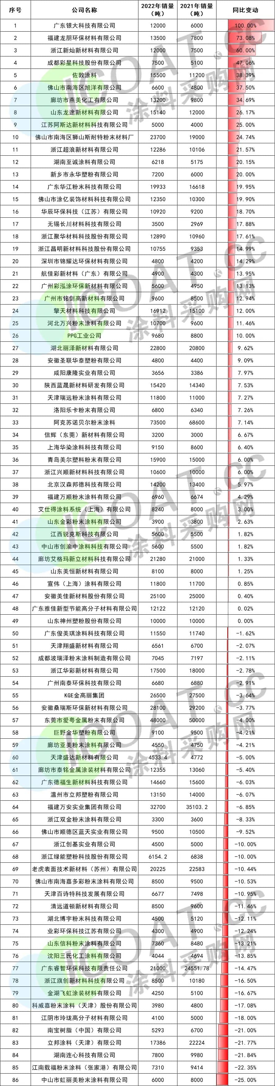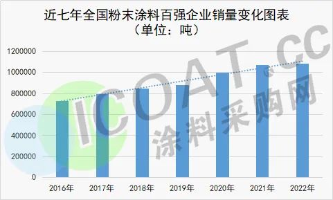 2022年伟德客户端官网百强首位的销量与2021年相比,增长了近5000吨,而末位的销量也增长了4000吨左右,可见2022年粉末涂料行业整体的销售量是有所上升的。
