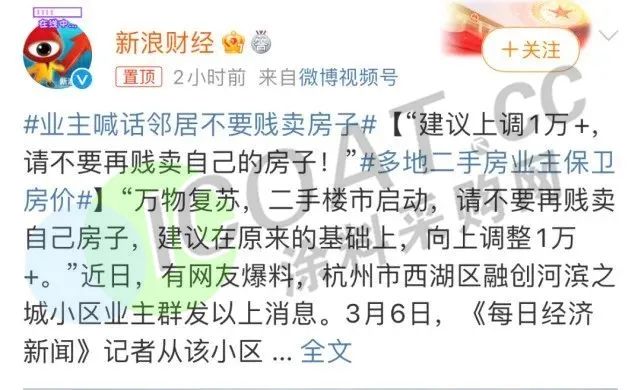 浙江杭州某个高端小区的小区业主呼吁:“万物复苏,二手楼市启动,请不要再贱卖自己房子,建议在原来的基础上,向上调整1万+”。