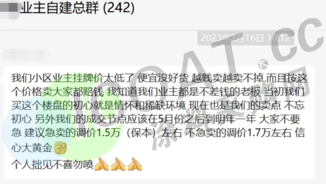 湖南长沙某小区业主喊话“越贱卖越卖不掉,我们的成交节点应该是5月份以后,建议不急卖的调价到1.7万元/平方米左右!”也就是说,挂牌价将比之前调高2000元/平方米。