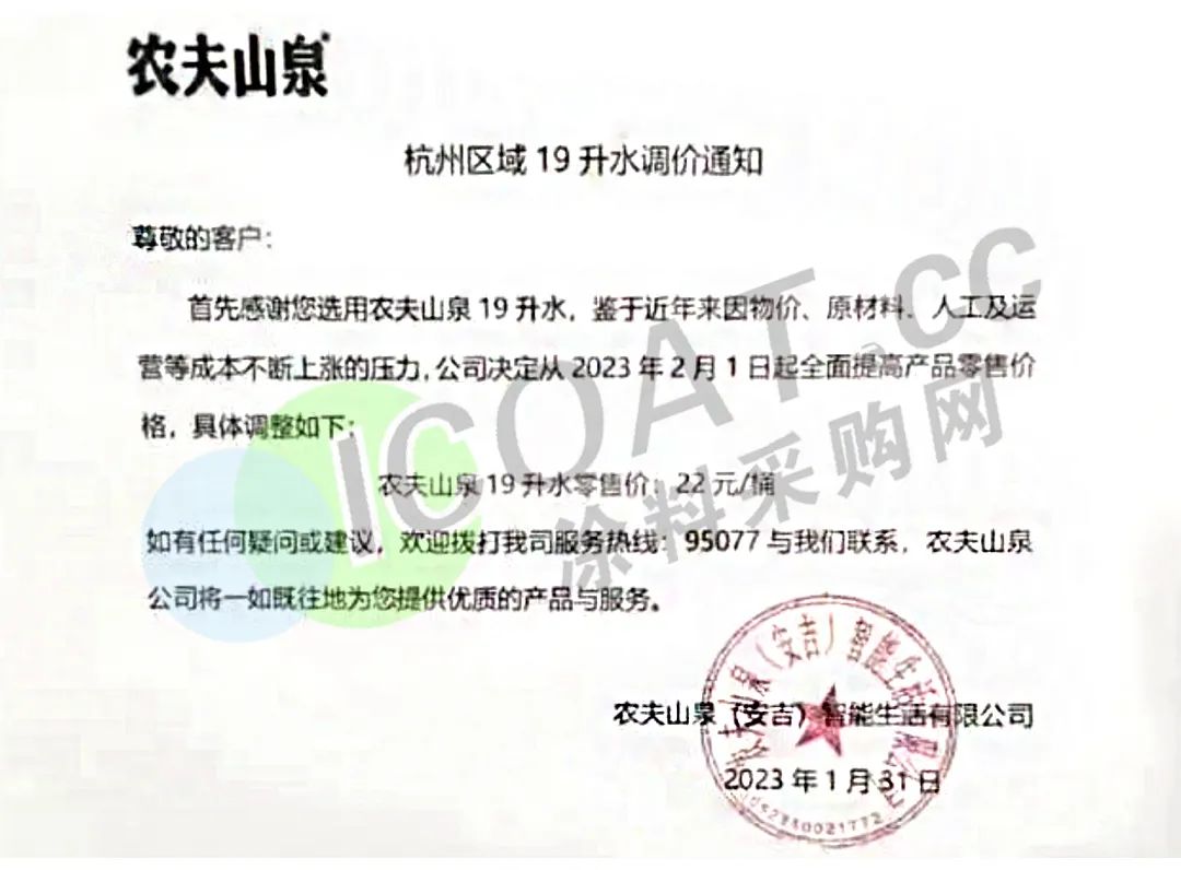 农夫山泉杭州区域将19L天然水零售价调整为22元/桶。