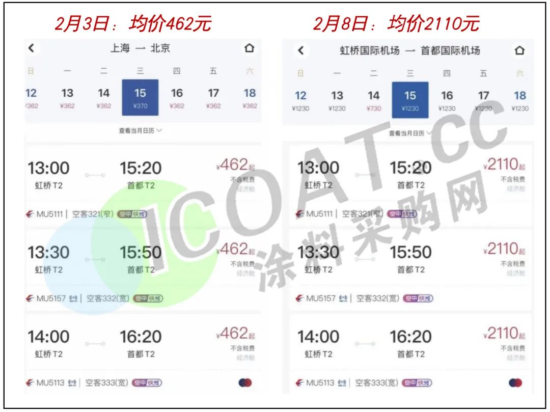 出行的票价也在上涨。同样的地点、同样的时间段,2月3日价格还不到500元,短短5天内,机票价格就普遍超过了2000元。