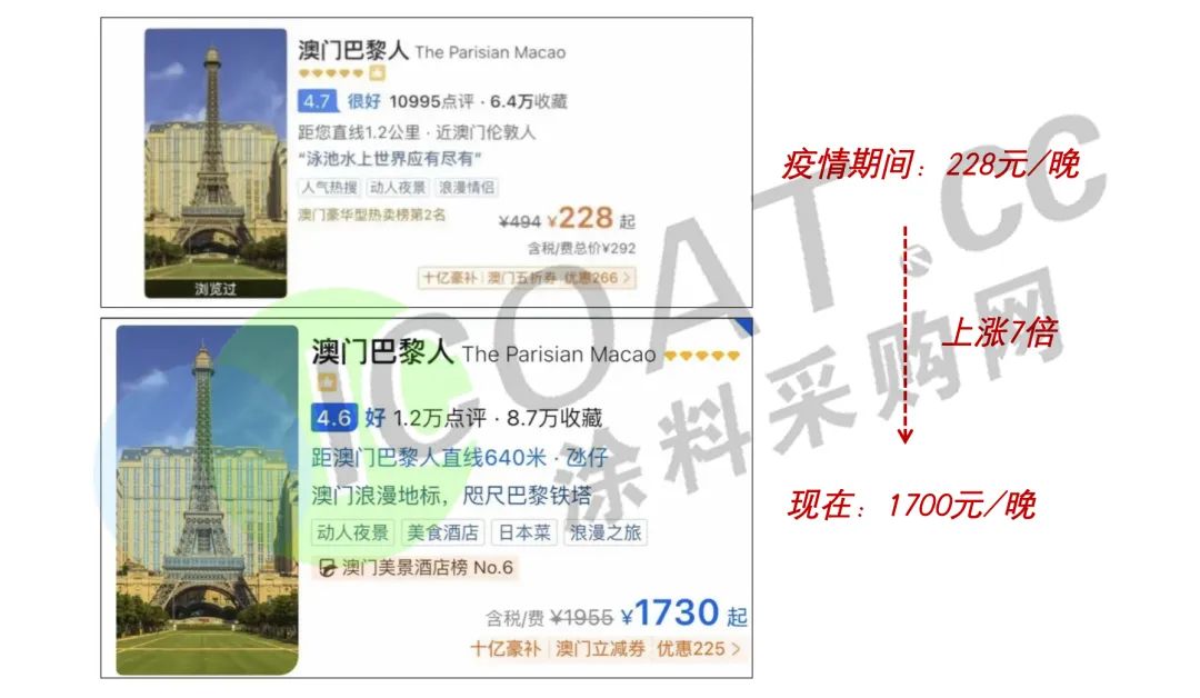 如家、汉庭等酒店突破500元,全季、桔子酒店基本600元以上,亚朵等更是普遍涨到700元以上。港澳地区部分酒店从疫情期间的200多元直接涨到了1700多元。
