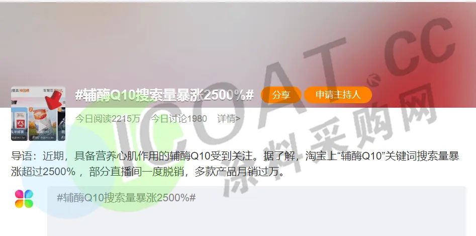 电商平台上搜索“辅酶Q10”的关键词量上涨了2500%,有的直播间出现断货现象,一些产品的月销量达到了一万件以上。许多线上线下渠道都已卖断货,有多名网友还爆料个别产品短期内价格涨幅明显,“一天一提价”引发广泛热议。