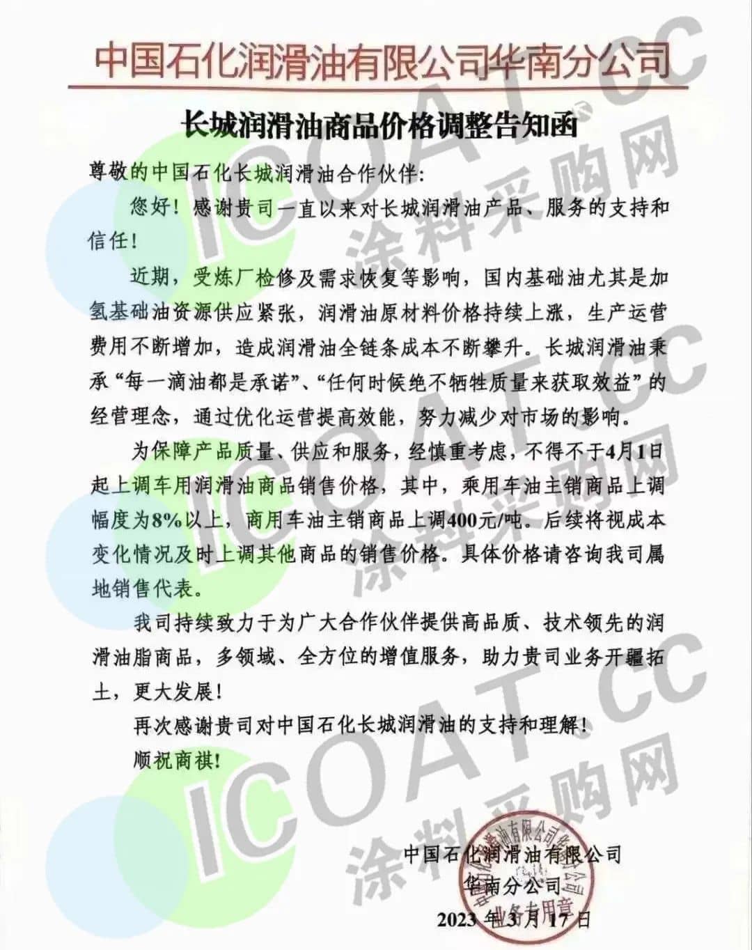 中国石化润滑油涨价函表示:决定于4月1日起上调车用润滑油商品销售价格,其中,乘用车油主销商品上调幅度为8%以上,商用车油主销商品上调400元/吨。
