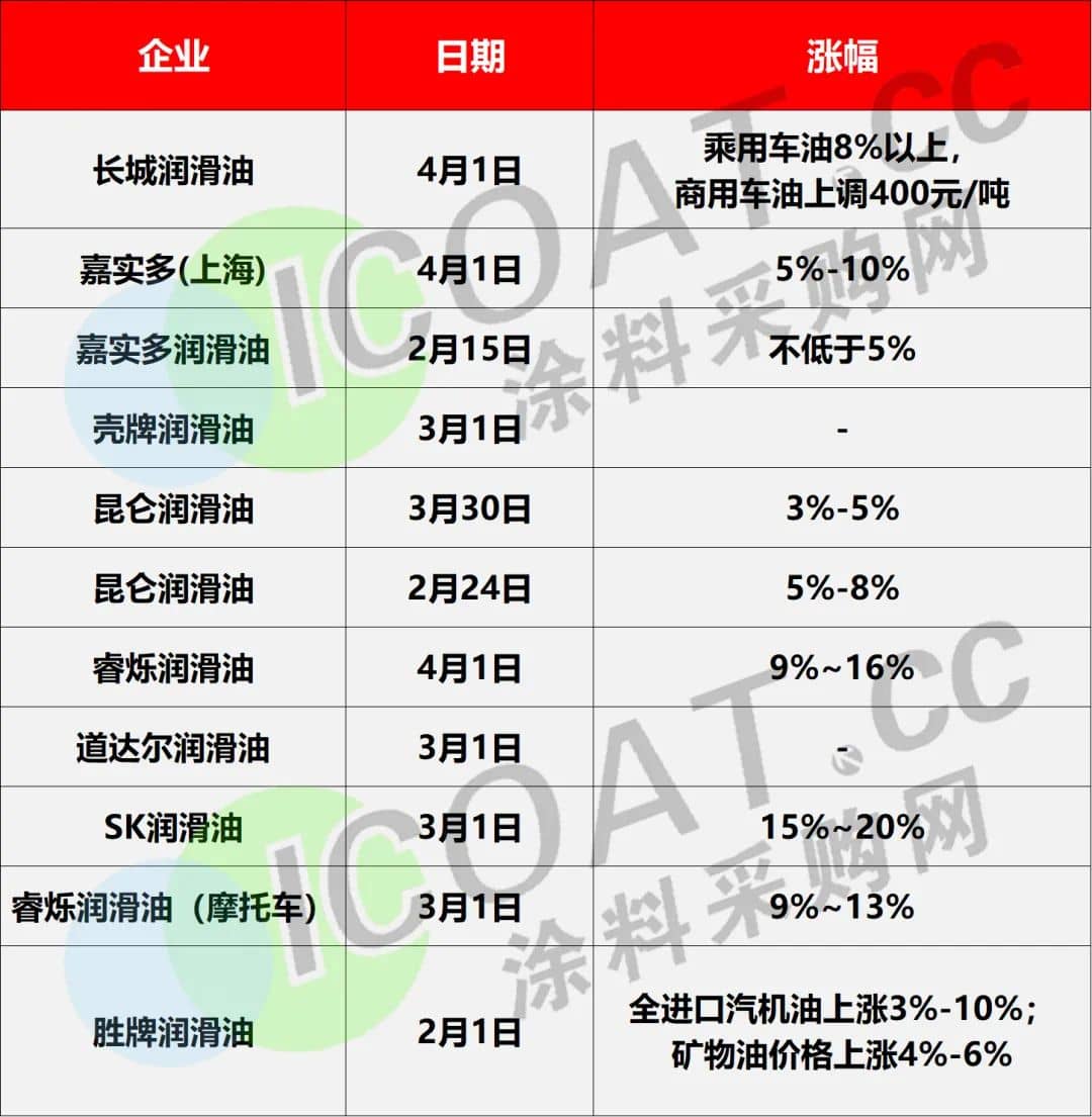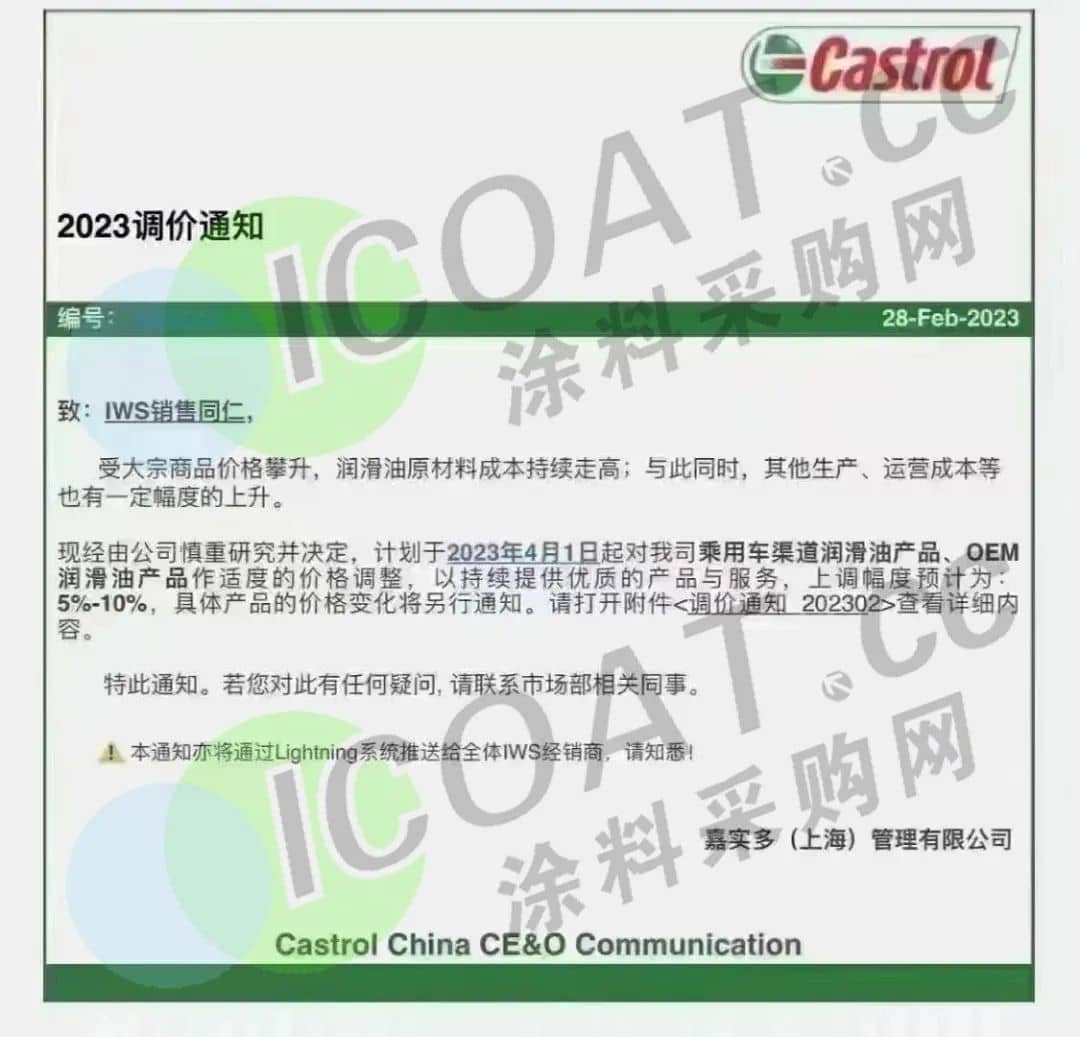 嘉实多润滑油则计划于2023年4月1日,对乘用车渠道润滑油产品、OEM润滑油产品作适度的价格调整,上调幅度预计为5%-10%。