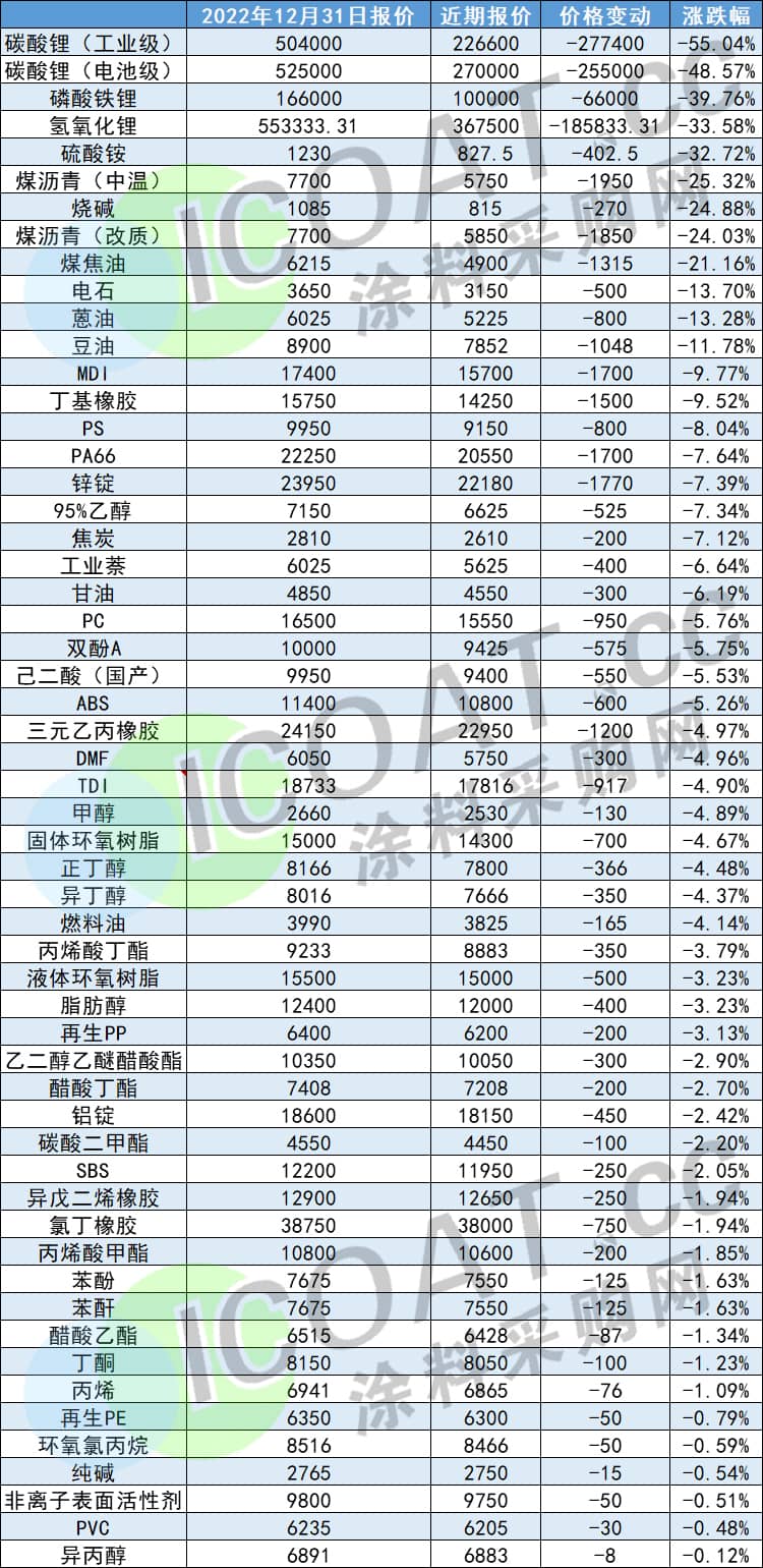 涂料采购网信息库数据显示,自2022年12月31日至2023年一季度末,共50多种化工品价格下跌,其中不乏新能源产业链上的锂系化工品,吨价下跌逾27万,跌幅超过55%。