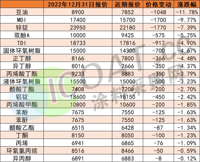 2023年一季度涂料产业链化工原料降幅榜(单位:元/吨)