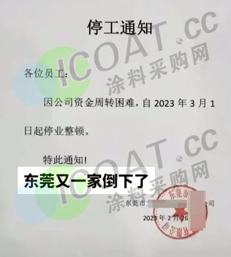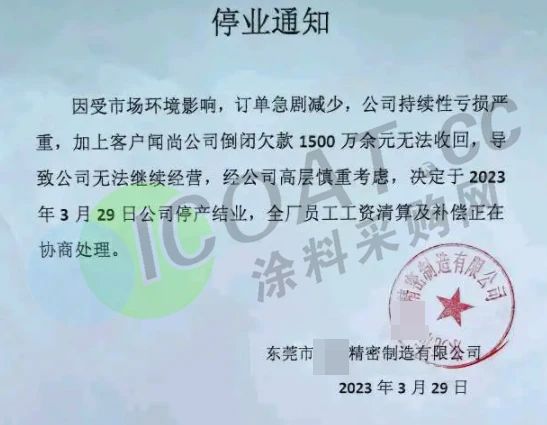 近日,广东省东莞某公司发布停业通知,称因受市场环境影响订单急剧减少,公司持续性亏损加重,加上客户倒闭欠款1500万余元无法收回,导致公司无法继续经营,经慎重考虑决定2023年3月29日停产结业,全厂员工工资清算及补偿正在协商处理。