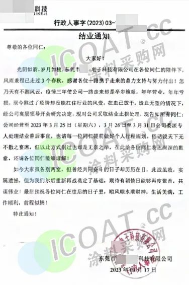 广东省某企业发布结业通知,称疫情三年使公司一路走来举步维艰,年年营业,年年亏损,现今熬过了疫情却没能扛住行业的风变,经研究决定,现对公司采取结业止损处理,公司经营至2023年3月25日,3月26日至3月31日公司委派专人处理结业普后事宜。