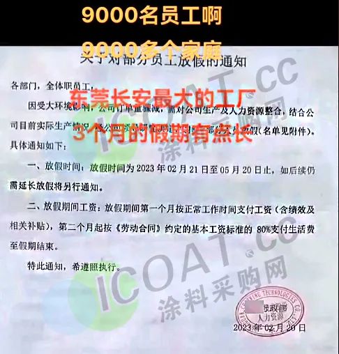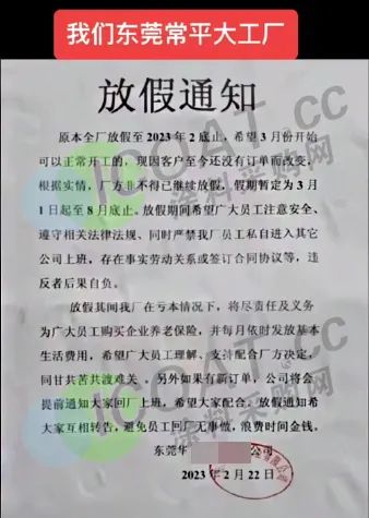 广东东莞某实业表示,因客户至今还没有订单,厂方不得已继续放假,假期暂定为3月1日起至8月底止。