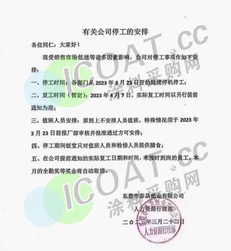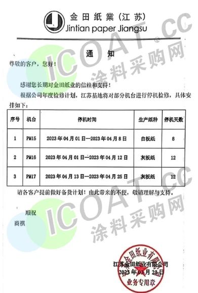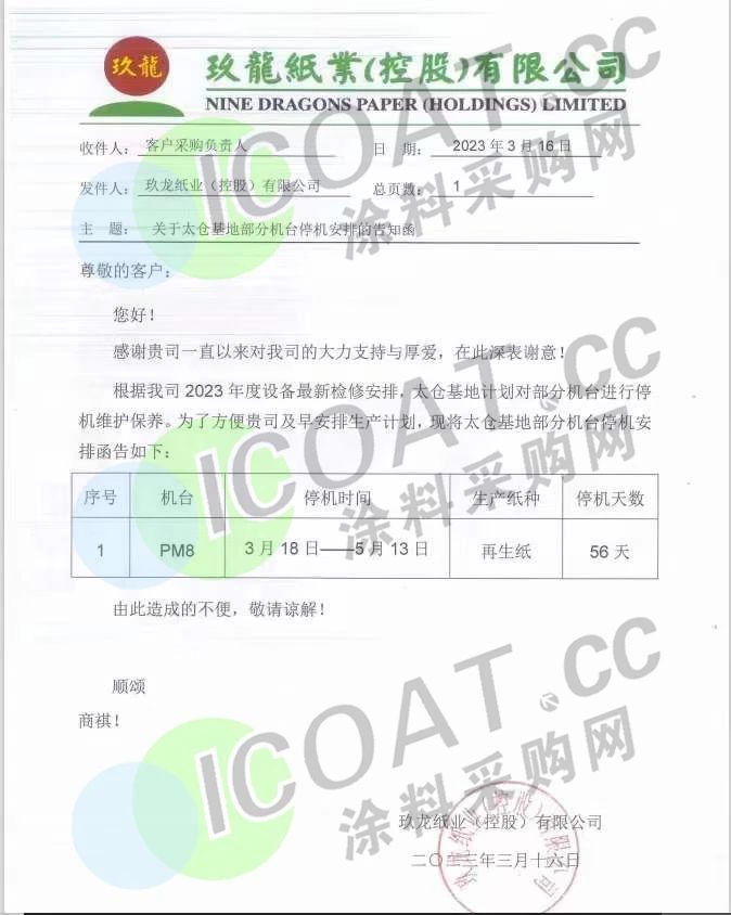 能够放假或者直接结业需要极大的勇气,而大部分的企业在艰难之下无法“破罐破摔”的走出这一步。据涂料采购网了解,在造纸行业,就有就有不少龙头企业发布停机公告,宣布停产2个多月。