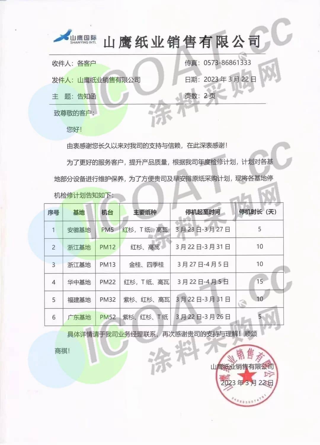 山鹰国际公告,旗下五大基地(安徽、浙江、华中、广东)涉及六台机器将于3月22日-4月5日轮流进行停机检修计划。