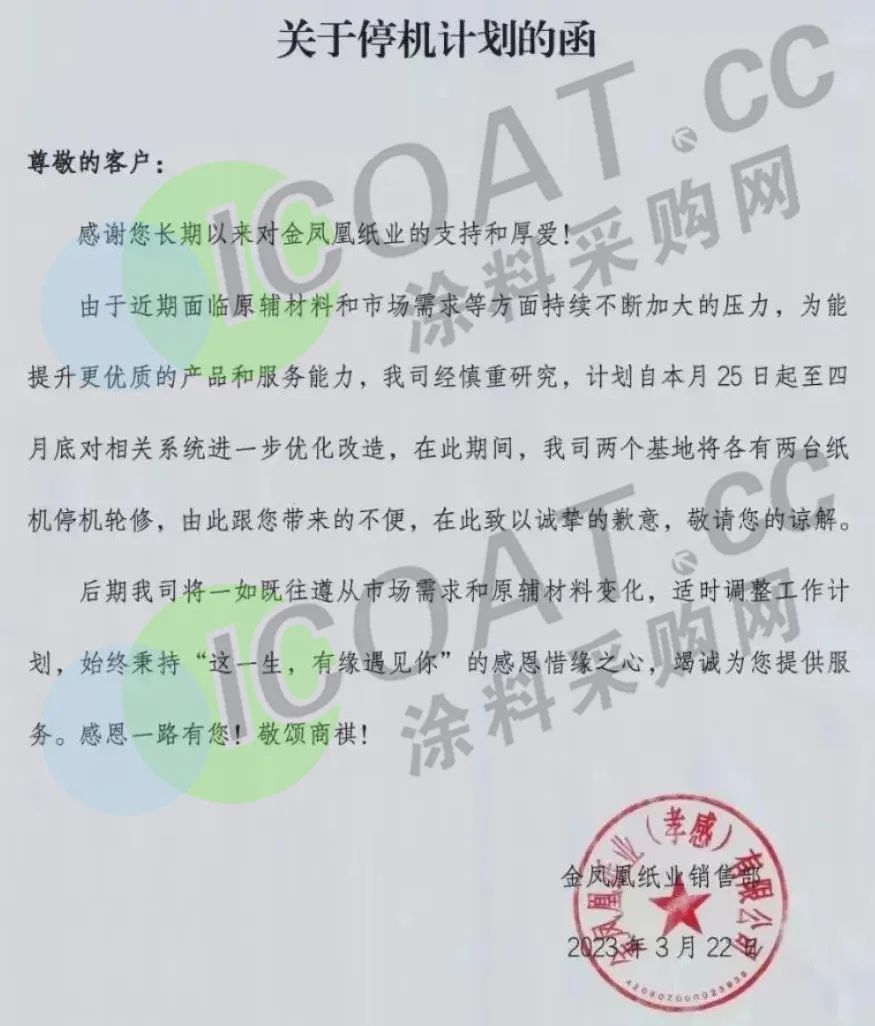 金凤凰纸业宣布,由于原材料和市场需求压力,计划自3月25日起至4月底对相关系统进一步优化改造,在此期间,公司两个基地各有两台纸机停机轮修。