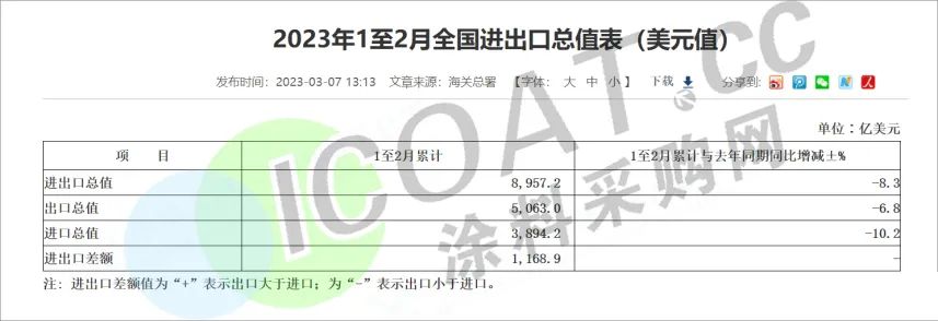 2023年1-2月,中国出口总额5063亿美元,同比下降6.8%,贸易顺差1168.8亿美元,同比扩大6.8%。