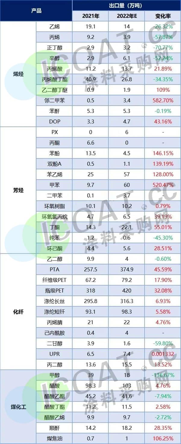 2022年部分化工品出口量统计