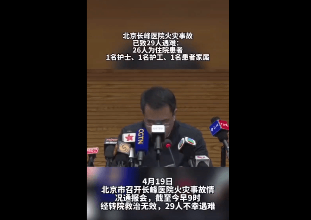 昨日(19日),北京市人民政府新闻办公室举行长峰医院火灾事故情况通报会。根据通报:4月18日12时57分,丰台区消防救援支队接警,北京长峰医院住院部东楼发生火情。13时33分,现场明火被扑灭。15时30分,现场救援工作结束,疏散转移患者71人。截至4月19日6时,71名转运伤员中,在院治疗39人,出院3人,死亡29人。