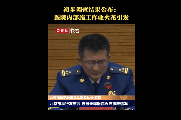 通报会上,北京市消防总队副总队长赵洋表示:经初步调查,事故系医院住院部内部改造施工作业过程中产生的火花引燃现场可燃涂料的挥发物所致,具体原因和损失还在进一步调查之中。