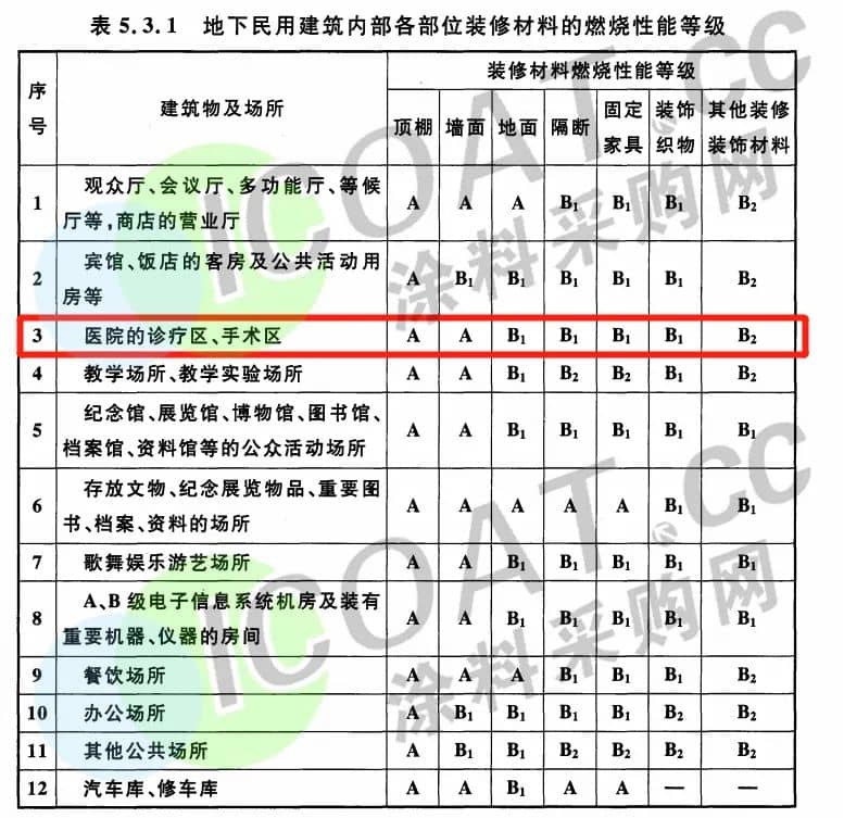 GB50222-2017《建筑内部装修设计防火规范》也明确规定,医院的诊疗区、手术区要求顶棚、墙面为A级,地面、隔断、固定家具、装饰织物为B1级,其他装修装饰材料为B2级。